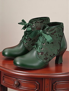 Damenstiefeletten aus grünem Samt im viktorianischen Vintage-Stil mit Spitzeneinsätzen | bequem und stilvoll für Cosplay und besondere Anlässe