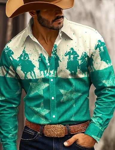 Herren Sterne Cowboy auf Pferd Hemd Westernhemd Knopfhemd Langarm Vintage-Retro Outdoor Lässig Arbeitskleidung Frühling Herbst Umlegekragen 3D-Druck Hemden mit Kragen Gelb Blau Orange Aprikose
