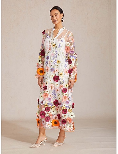 Damen Midikleid Shiftkleid Elegant Urlaub Hochzeitsgast Ferien Spitze Normale Passform Blumen Langarm V Ausschnitt Weiß