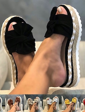 Schwarze Flip-Flops mit geknotetem Plateau und Keilabsatz für Damen – Boho-Sommersandalen mit Espadrille-Absatz für Pool-, Strand- und Freizeitoutfits