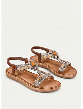 Verzierte braune Sandalen im Boho-Stil für Damen – flache Zehentrenner mit Kristallen für Sommerfestivals, Strandausflüge und zwanglose Zusammenkünfte
