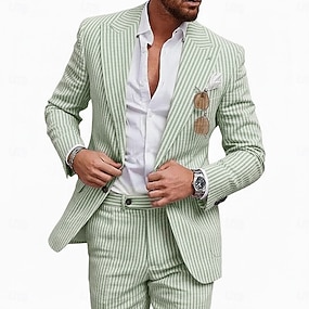 Herren Anzüge Seersucker-Anzüge Strandhochzeit Lässig Salbei Sommer Anzug Gekerbtes Revers Formell Gestreift Standard Passform 2-teilig Einreihige Zwei-Knopf-Jacke