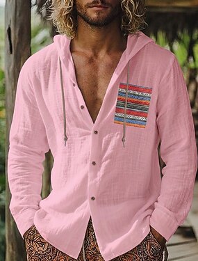 Herren Hemd Leinenhemd Sommerhemd Strandhemd Knopfhemd Kapuzenhemd Boho Lässig Urlaub Rosa Grün Langarm Mit Kapuze Sommer Frühling Bekleidung Patchwork