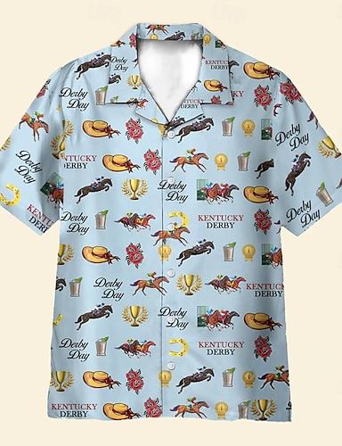 Kentucky Derby Herren Hut Cowboy Pferderennen Hemd Kuba-Kragen-Hemd Kurzarm Vintage-Retro Urlaub Ferien Festival Sommer Frühling Hemd mit Camp-Kragen 3D-Druck Lustige Kentucky Derby-Shirts Blau