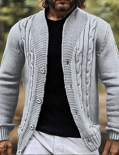 Herren Pullover Strickjacke Kurzer Pullover Gerippt Zopfmuster Stricken Strick Feste Farbe Schalrevers Moderne zeitgenössische Casual Freizeitskleidung Bekleidung Herbst Winter Marineblau Beige S M L