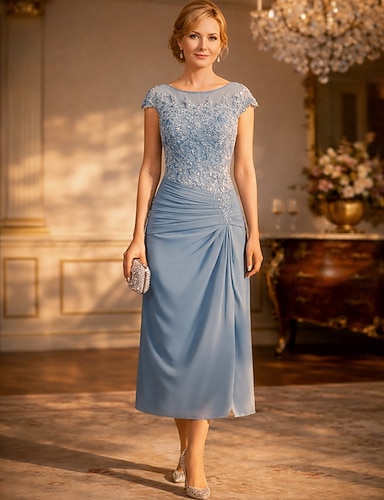 Schlauchkleid Bodenlang Kleid für Hochzeitsgäste Abendkleid Figurbetontes Kleid Brautmutterkleid Halbarm Juwelenhals Elegant Übergröße Hochzeitsgast Chiffon Spitze mit Applikationen Raffung