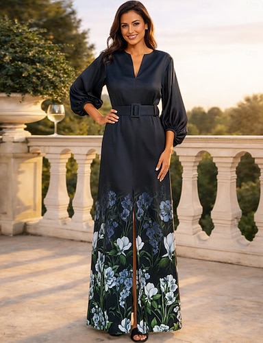 A-Linie Bodenlang Hemdblusenkleid Kleid für Hochzeitsgäste Abendkleid Brautmutterkleid Langarm Hemdkragen Elegant Vintage Hochzeit Formell Nylon mit Blumenmuster Schleife(n) Tasche