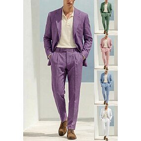 Herren Leinenanzüge Strandhochzeit Lässig Rosa Himmelblau Frühling & Sommer Anzug Gekerbtes Revers Mode Täglich Einfarbig Figurbetonter Schnitt 2-teilig Einreihige Zwei-Knopf-Jacke