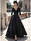 A-Linie Asymmetrisch Kleid für Hochzeitsgäste Brautmutterkleid Dreiviertelarm V Ausschnitt Elegant Vintage Formell Satin mit Spitze Applikationen Einfarbig