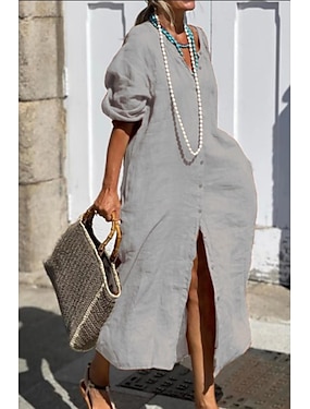 Damen Maxikleid Baumwoll-Leinen-Kleider Hemdblusenkleid Freizeitkleid Basic Lässig Urlaub Täglich Normale Passform Einfach Langarm Hemdkragen Grau Sommer Frühling