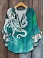 Damenbluse Langarm Pullover Oberteil Blatt Druck Glockenärmel Grün Schimmer Lässig Bohemian Rundhals Übergröße Frühling Sommer Bekleidung