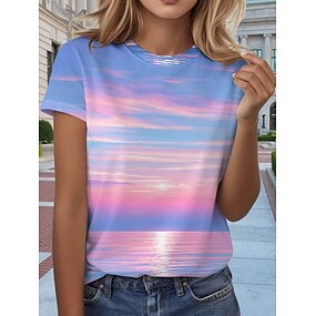 Damen T Shirt Druck Ombre Grafik Bohemien Hawaiianisch Stilvoll Kurzarm Rundhalsausschnitt Normale Oberteile Täglich Blau Rosa Purpur Sommer Frühling