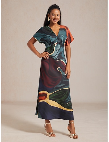 Damen Maxikleid Satin abstrakter Platzierungsdruck Dolmanärmel V-Ausschnitt Taillenband elegant lässig Urlaub Frühling Sommer Herbst
