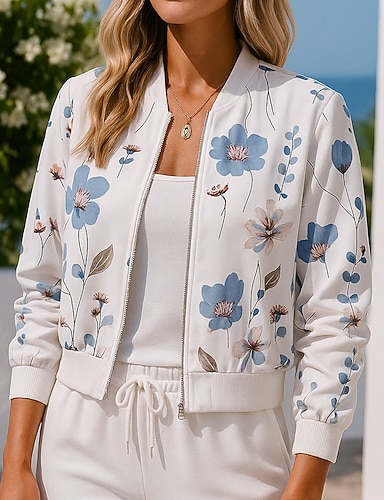 Damen Blumendruck Outdoor-Freizeit-Coatv Jacke mit durchgehendem Reißverschluss Herbst Langarm Athleisure Mode Outdoor Reise Sport Weiß Sportbekleidung Sportkleidung