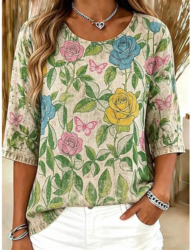 Damen Bluse Druck Blumen Grafik Bohemien Vintage Tropisch Dreiviertelarm Rundhalsausschnitt Lange Oberteile Lässig Täglich Urlaubskleidung Gelb Sommer Frühling