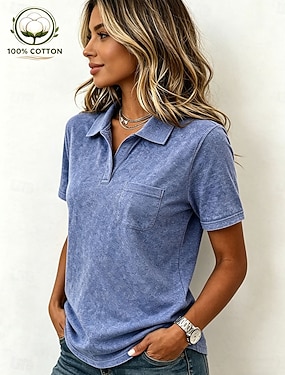 Damen Hemd 100% Baumwolle Einfach Täglich Stilvoll Basic Kurzarm V Ausschnitt Normale Oberteile Täglich Arbeit Ferien Blau Weiß Grau Sommer