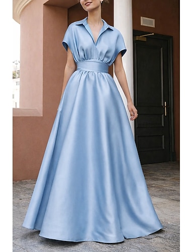 A-Linie Bodenlang Abendkleid Festliche Kleidung Elegant Täglich seidig Kurzarm Hemdkragen Hochzeit Formell Satin mit Gerafft