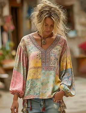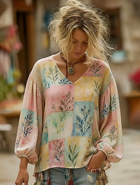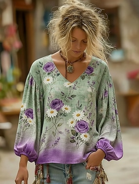 Damen Hemd Boho-Hemd Kunstbaumwollleinen Druck Blumen Grafik Bohemien Vintage Klassisch Langarm V Ausschnitt Normale Oberteile Täglich Ferien Ausgehen Grün Sommer Frühling Herbst