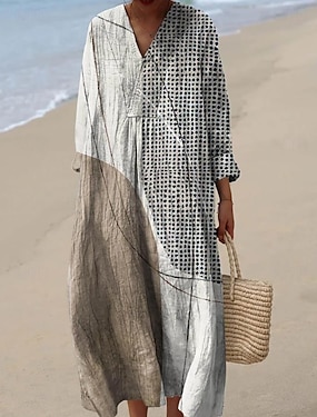 Damen kleid lang Casual kleid Boho Chic Kleider Langärmliges Boho-Kleid Böhmen Strassenmode Maxi Urlaub Strasse Festtage Lockere Passform Geometrisch Farbblock V Ausschnitt Rosa Blau Grün Sommer