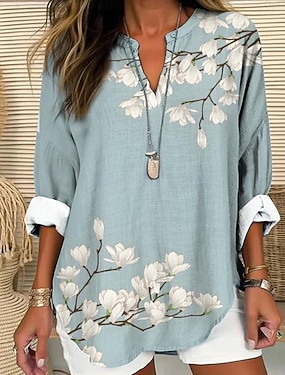 Damen Sommeroberteile Blumen Grafik 3D Bohemia Vintage Täglich 3/4-Länge Ärmel Halblang V-Ausschnitt Reguläre Oberteile Täglich Urlaub Strandmode Raffung Bestickte Druck Denim Blau Marineblau