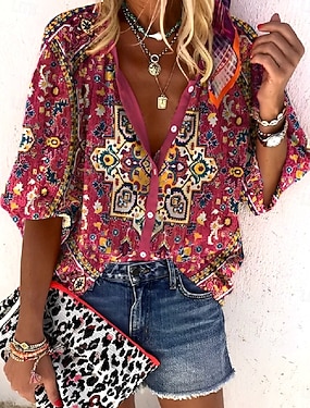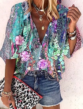 Damenbluse V-Ausschnitt Floral Grafik Elegant Bohemia Ethnisch 3/4-Ärmel Reguläre Oberteile Alltag Urlaub Freizeit Rüsche Print Königsblau Blau Helllila Khaki Sommer Frühling Herbst