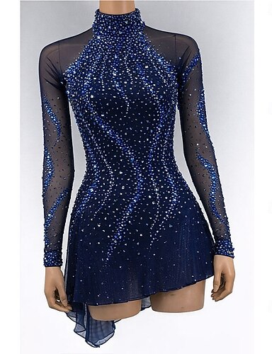 Eiskunstlaufkleid Damen Mädchen Eislaufen Kleid Dunkelmarine Offener Rücken Asymmetrischer Saum Netzstoff Hohe Elastizität Training Wettbewerb Eiskunstlaufkleidung Klassisch Kristall / Strass Langarm