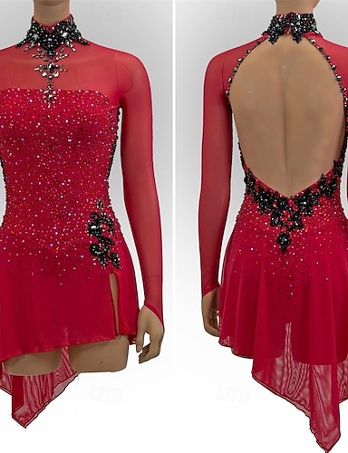 Eiskunstlaufkleid Damen Eislaufen Kleid Rot Patchwork Offener Rücken Dehnbar Training Wettbewerb Eiskunstlaufkleidung Klassisch Kristall / Strass Langarm Eislaufen Eiskundstlauf