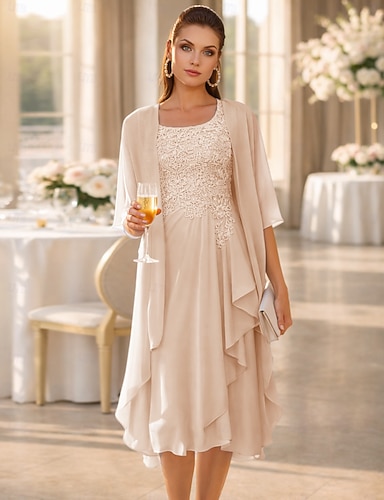 Zweiteilig Schlauchkleid Knielang Kleid für Hochzeitsgäste Brautmutterkleid Dreiviertelarm Juwelenhals Elegant Formell Hochzeitsgast Kirche Chiffon Spitze Mit Schal Jackenkleider mit Perlenstickerei