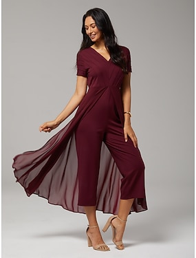 Damen-Jumpsuit, rot, V-Ausschnitt, getäfeltes Design, zweiteilig, fließend, transparenter Look, Stretchstoff, lässig, Frühling, Sommer, Herbst