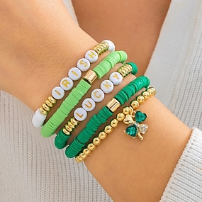 Damen-Set aus Armband und Ohrringen mit Kleeblattmotiv aus einer Legierung und Acryl, grüne und weiße Perlen, perfekt für den St. Patrick's Day und den Alltag.