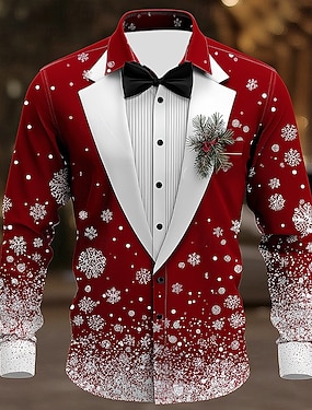 Weihnachten Herren Schneeflocke Weihnachtskostüm Smokinghemd mit Anzugkrawatte und Aufdruck Hemd Knopfhemd Langarm Lustig Outdoor Ferien Frühling Herbst Umlegekragen 3D-Druck Hemden mit Kragen Rot 1