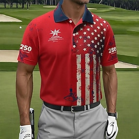4. Juli 2026 250. Herren Amerikanische US-Flagge Golf Sport-Poloshirts Kurzarm Polo-Shirts Hemden mit Kragen Lässig Athleisure Knöpfe Frühling & Sommer Blau Rote
