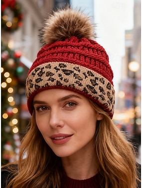 Weihnachts-Strickmütze für Damen mit Kunstfellbommel, warme Wintermütze mit Leopardenmuster, stylisches Urlaubsaccessoire für Outdoor- und Festtagsoutfits