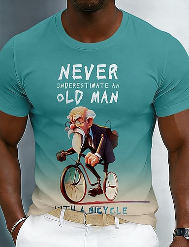 Unterschätze niemals einen alten Mann mit Fahrrad! Lustiges Herren-T-Shirt mit 3D-Cartoon-Grafik und Radfahrermotiv, Kurzarm, Rundhalsausschnitt, türkisfarbener Farbverlauf, lässiges T-Shirt,