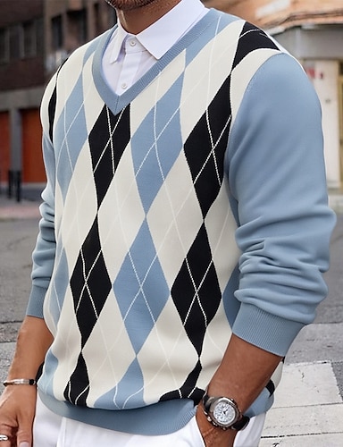 Herren Pullover Strickpullover Gerippt Stricken Normale Oberteile Gestrickt Karomuster V Ausschnitt Mode Basic Urlaub Alltagskleidung Bekleidung Herbst Winter Leicht Blau S M L
