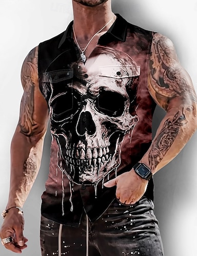 Herren Schädel Skelett Horror Hemd Knopfhemd Ärmelloses Shirt Ärmellos Dunkler Gothic-Stil Outdoor Lässig Sommer Frühling Umlegekragen 3D-Druck Zwei Fronttaschen Blau Rosa Purpur Grün