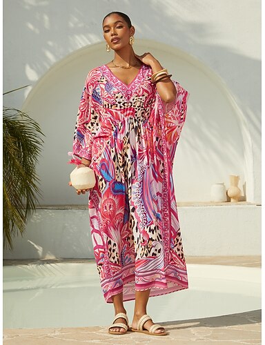Urlaubskleid aus farblich abgesetztem Blumenmuster, Dolmanärmeln und lockerer Passform, aus Viskose-ähnlichem Material