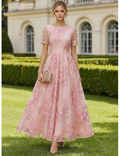 A-Linie Knöchellänge Tee-Länge Blumenkleid Cocktailkleider Elegant Blumen Halbformell / Cocktail Kurzarm U-Boot-Ausschnitt Gartenparty Hochzeit Organza Jacquard mit Falten