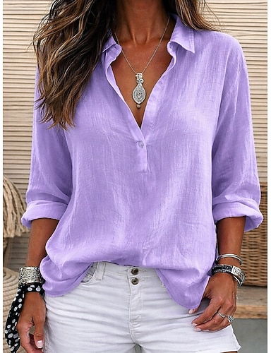 Damen Bluse Hemd aus Leinenimitat Knöpfe Einfarbig Stilvoll Lässig Dreiviertelarm V Ausschnitt Normale Oberteile Täglich Weiß Hellgrün Rosa Purpur Sommer Frühling Herbst