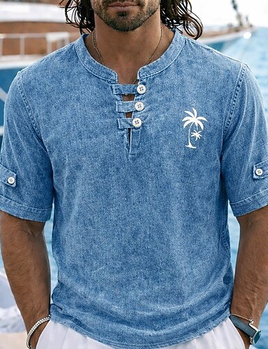 Herren Poloshirts Hemd aus 100 % Baumwolle in Säurewaschung Lässig Ferien Kragenlos Kurzarm Mode Basic Palme Knöpfe Jahrgang Sommer Frühling Blau Rote Purpur Grün Grau Poloshirts