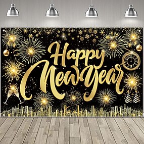 Silvesterparty mit schwarz-goldenen Dekorationen und Pailletten-Hintergrund – glitzerndes schwarz-goldenes Stoffbanner für die Neujahrsparty 2026, Fotoautomat &Feiertagsdekoration