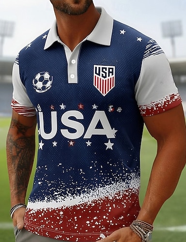 Fußball-Pokal 2026 Herren Amerikanische US-Flagge Poloshirts Kurzarm Polo-Shirts Hemden mit Kragen Lässig Athleisure 3D-Druck Knöpfe Frühling & Sommer Weiß