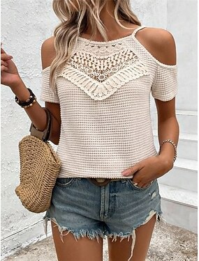 Damen Schulterfreies Oberteil Waffelstricktops Spitze Patchwork Bestickt Einfarbig Elegant Stilvoll Lässig Kurzarm Kalter Schulter-Ausschnitt Normale Oberteile Täglich Ausgehen Schwarz Aprikose