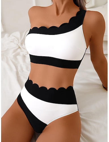 Frauen Bikini 2-teiliges Badeanzug Ein Schulter Farbblock Cheeky Bauchkontrolle Hohe Taille Schlank Rückenfrei Urlaub Strandbekleidung Einfarbig V-Hals Ärmellose Badeanzüge