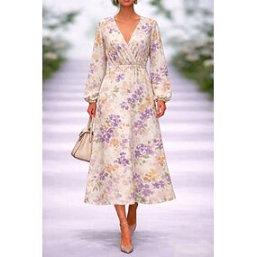 Damen Midikleid A Linie Kleid Figurbetontes Kleid Urlaub Geburtstag Lässig Date Normale Passform Blumen Grafik Langarm V Ausschnitt Blau Rosa Purpur Grün Sommer Frühling