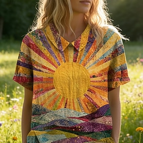 Damenbluse mit Knöpfen, geometrischem Print, Farbblockmuster, Kurzarm, strukturiertem Stoff, Hemdkragen, normaler Kragen, Regenbogenfarben, ideal für Urlaub, Freizeit und Ausgehen, Sommer und