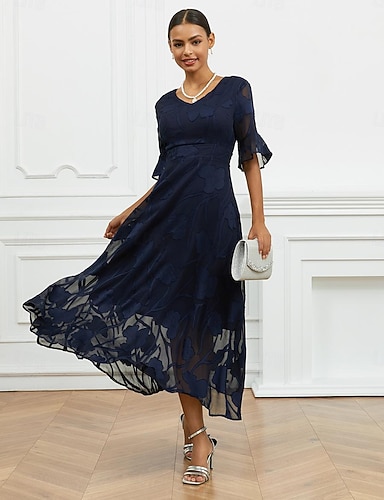 Damen Teelänge A Linie Kleid Elegant Formell Hochzeitsgast Cocktailparty Normale Passform Blumen Kurzarm Rundhalsausschnitt Dunkelblau Sommer