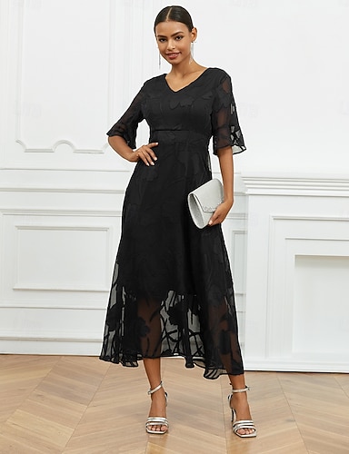 Damen Weiblich Freizeitkleid Midikleid Schwarz Halbärmel Sommer Frühling Herbst V Ausschnitt Urlaub XS S M