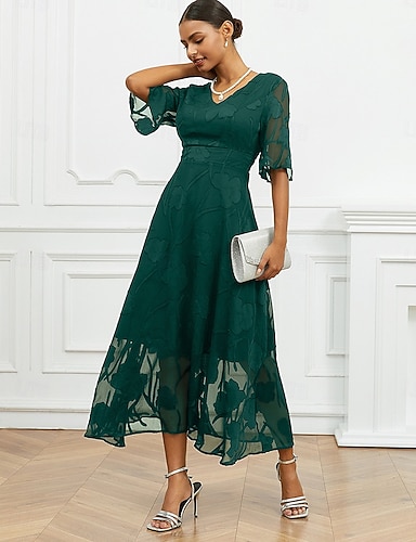Damen Elegantes Kleid Grün Kurzarm Jacquard Jacquard Frühling & Sommer V Ausschnitt elegante kleider Urlaub Date S M L