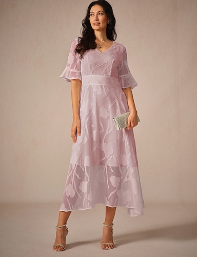 Damen Knielanges Kleid Kleid der Brautjungfer A Linie Kleid Elegant Volantärmel Hochzeitsgast Cocktailparty Normale Passform Einfach Kurzarm V Ausschnitt Rosa Blau Grün Sommer